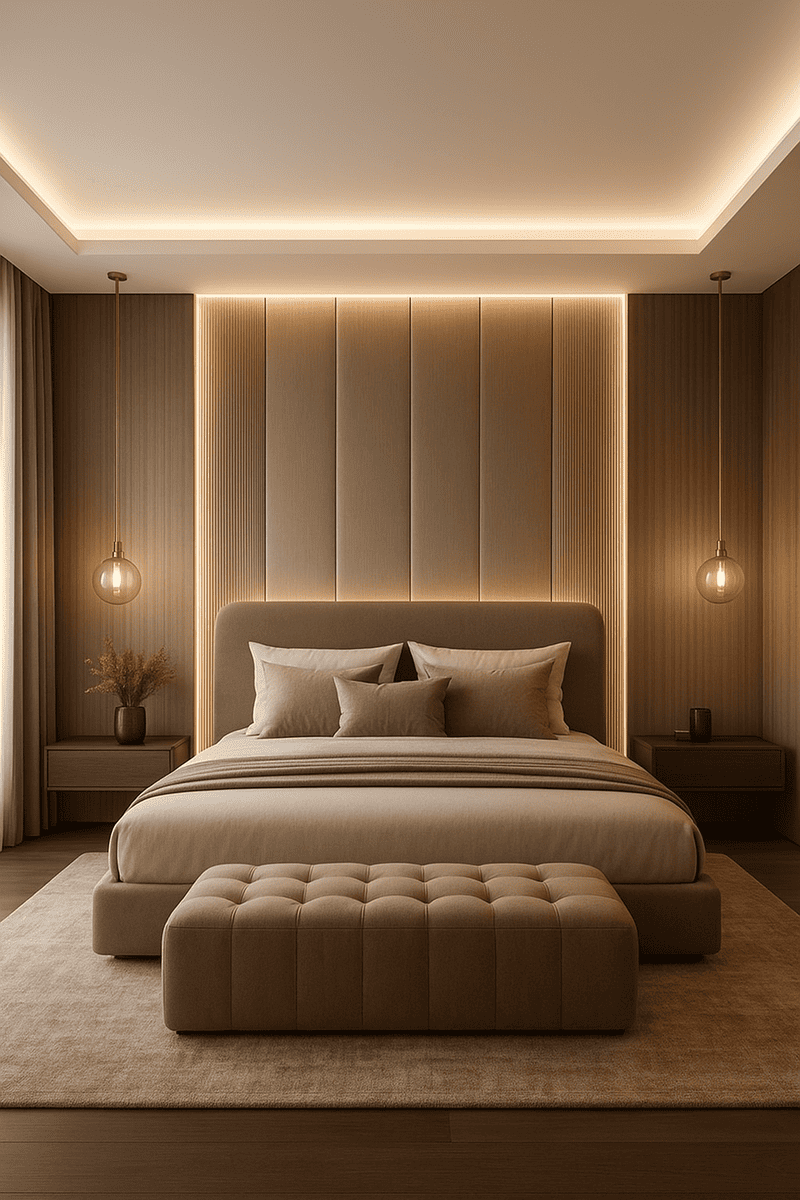 Nyugodt és kiegyensúlyozott, ahol a színek, anyagok és világítás együtt teremtik meg a pihenéshez szükséges hangulatot.